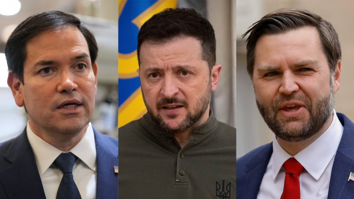 Зліва направо: держсекретар США Марко Рубіо, президент України Володимир Зеленський та віцепрезидент США Джей Ді Венс. Getty Images/AFP/Mark Schiefelbein; АР/Efrem Lukatsky; Getty Images/Corbis/Antoine Gyori