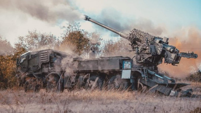 Самохідна артилерійська установка (САУ), яка перебуває на озброєнні 48-ї окремої артилерійської бригади ЗСУ, виконує постріл по позиціям армії РФ. Facebook/48 окрема артилерійська бригада