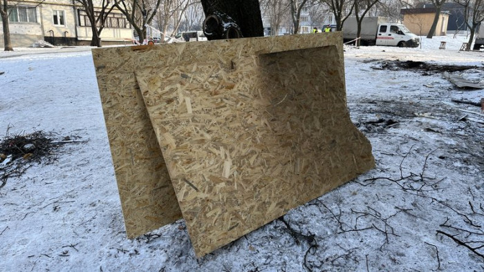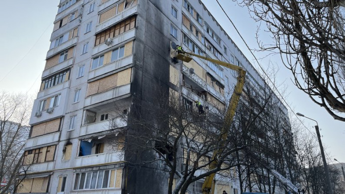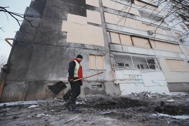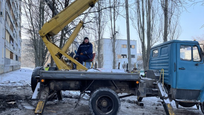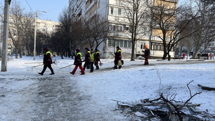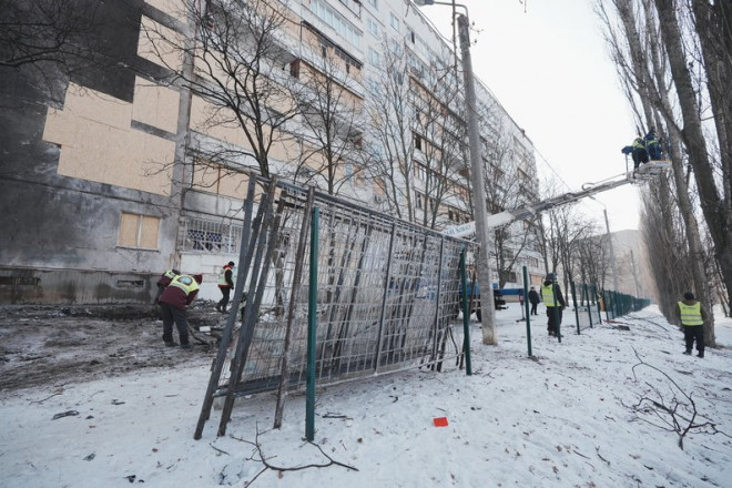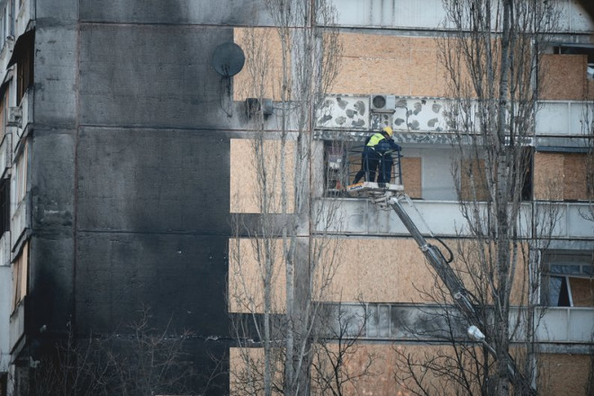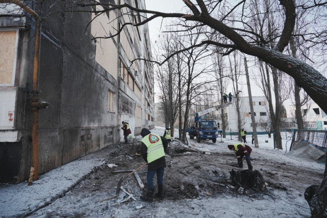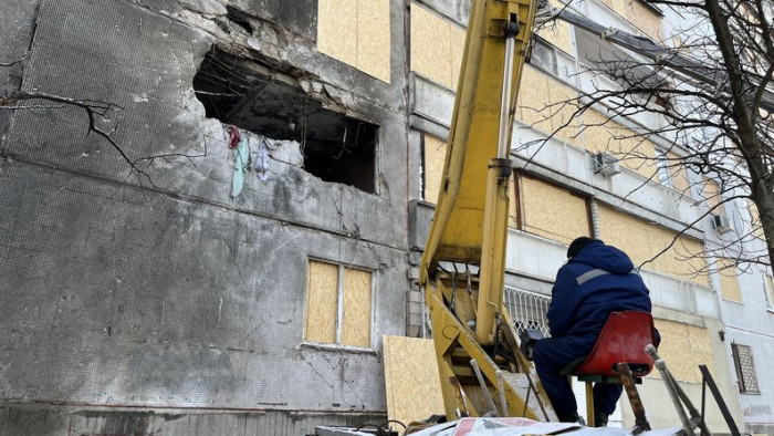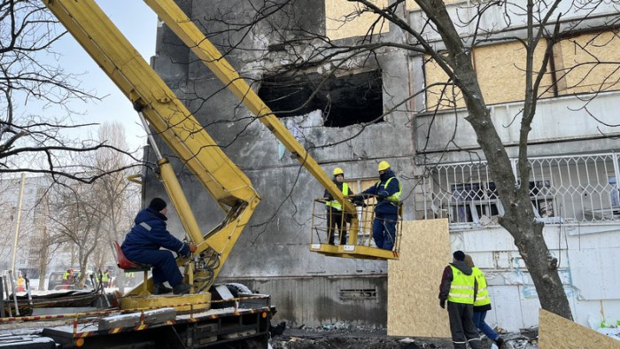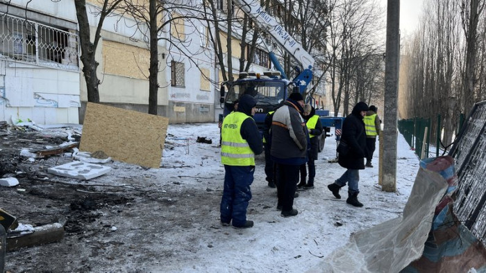 Вранці на Північній Салтівці у Харкові усувають наслідки російського влучання по багатоповерхівці. Комунальні служби розчищають побутове сміття та забивають вікна, що були вибиті внаслідок нічного обстрілу.