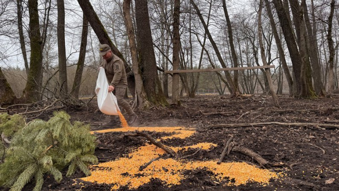 Єгер розкладає суху кукурудзу та листяні віники у тимчасовому місці підгодівлі диких тварин. Для оленів та косуль теж є годівниця — туди викладають ще й сіль.