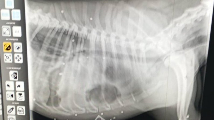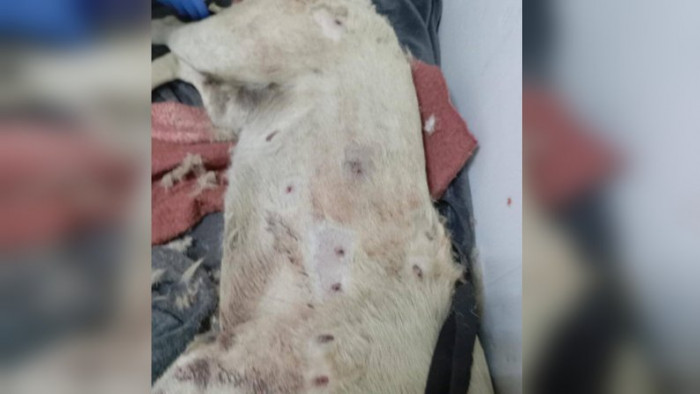 Біляш після поранення у ветклініці. Особистий архів Оксани"Ні. Це не дрон. Це дробь. Ну, воно ж видно. Він просто як решето був. Цілеспрямовано його розстрілювали. І зверху, і правий бік весь, і лапки".