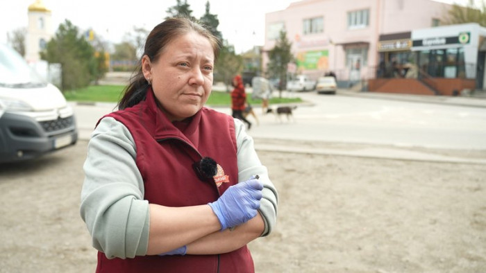 В Балабине пса евакуювали військові з прифронтового Гуляйполя. Його військові вивезли з-під обстрілів, розповідає продавчиня Анжела: