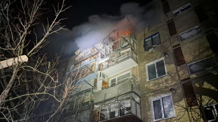 Пожежа в одній з багатоповерхівок Нікополя внаслідок обстрілу армією РФ, 11 лютого 2025 року. Сергій Лисак/Telegram
