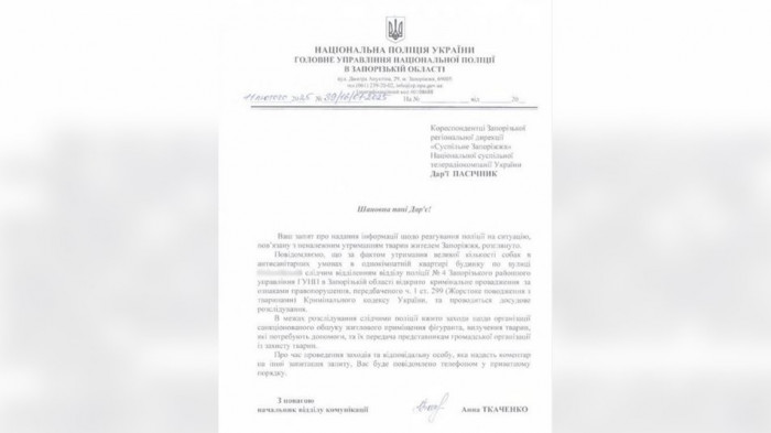 Відповідь Національної поліції на запит кореспондентів Суспільного щодо великої кількості тварин в однокімнатній квартирі у Запоріжжі. Суспільне Запоріжжя