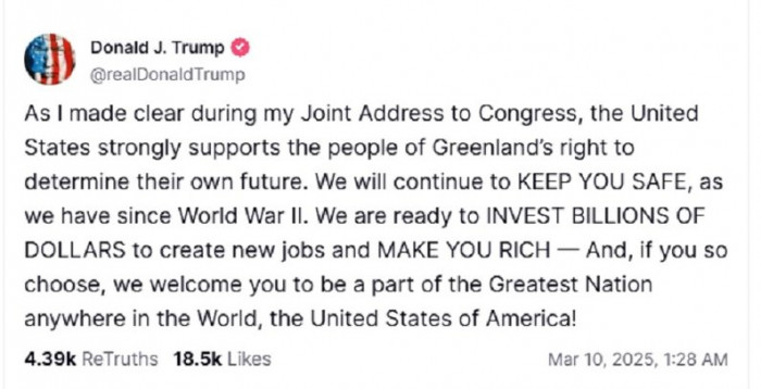 "Ми й надалі дбатимемо про вашу безпеку, як ми це робили з часів Другої світової війни. Ми готові інвестувати мільярди доларів, щоб створити нові робочі місця і зробити вас багатими", — написав Трамп у соцмережі Truth Social.